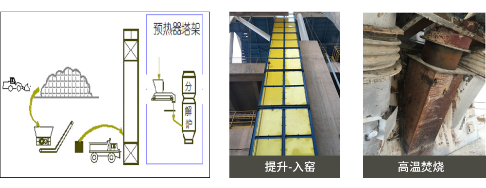 經拆包、分揀、破碎后,用廠內專用危險廢物運輸車輛(密閉形式),轉運至窯尾固態廢物處置線提升機,經提升機提升至窯尾平臺,再經皮帶機、鎖風等裝置投入窯尾煙室,實現高溫焚燒處置。