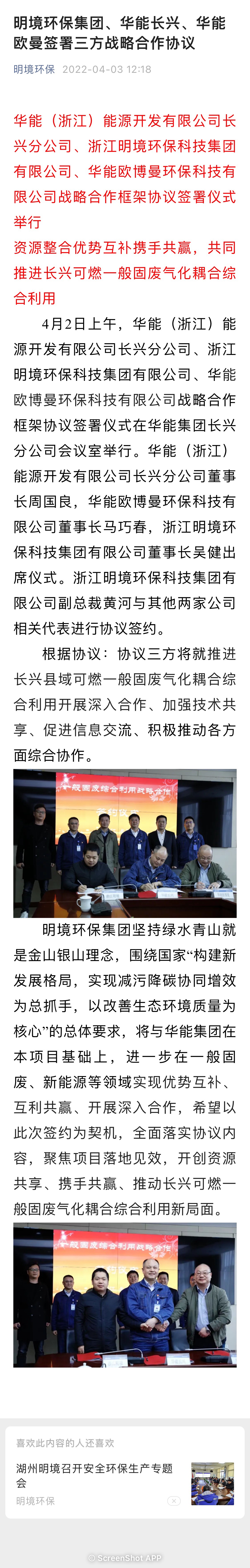 明境環保集團、華能長興、華能歐博曼簽署三方戰略合作協議